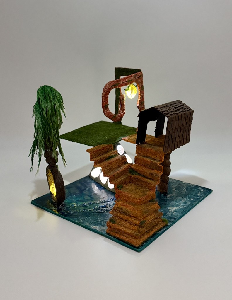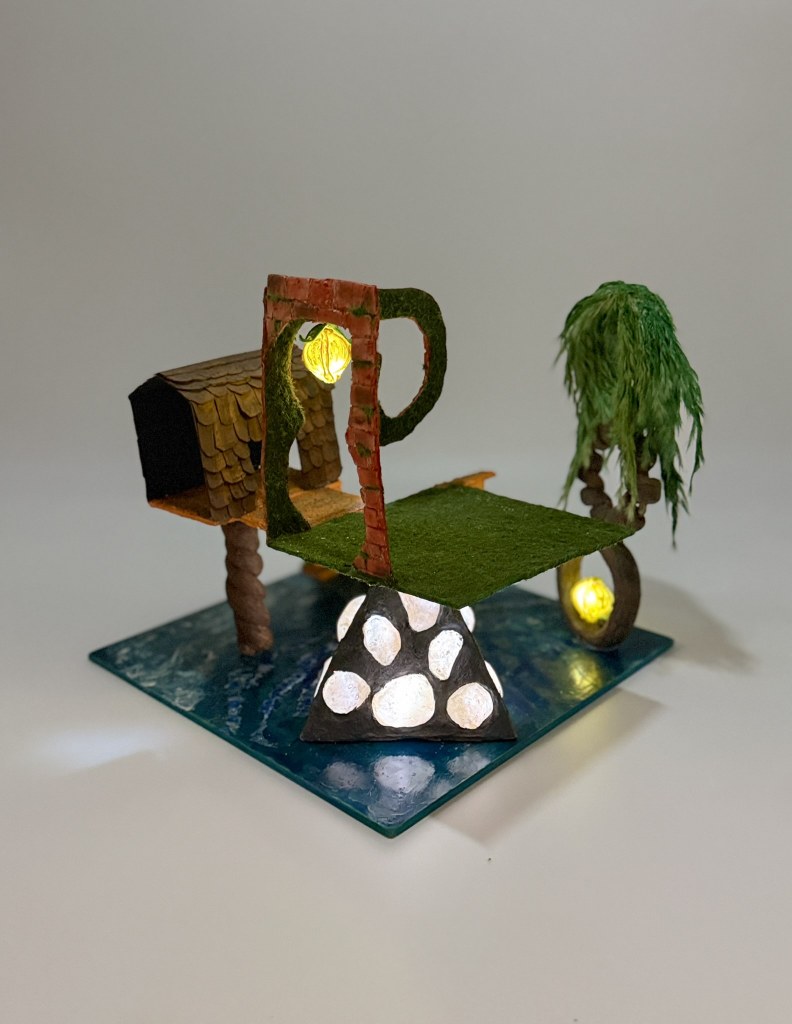 This sculpture is an abstract interpretation of Robert W. CrownMemorial State Beach in Alameda CA. It is a park where I frequently walk my dog. I took inspiration from the various textures and shapes of natural and man-made elements. When creating this sculpture I wanted to showcase that light plays a significant role in how we take in the world. This sculpture is a great interpretation of how my mind functions.As I walk around my mind is in a constant state of creating. I see all these shapes and textures and reshape them in my mind.