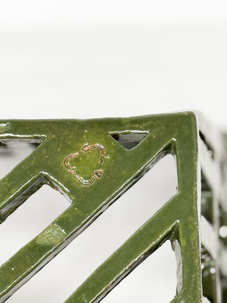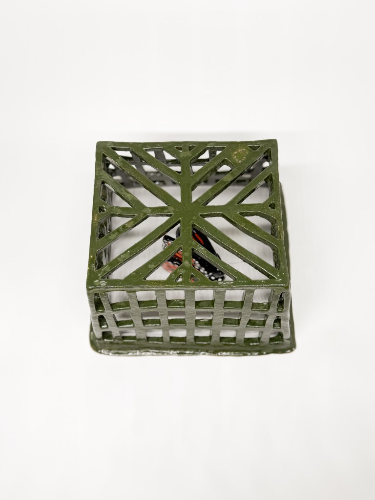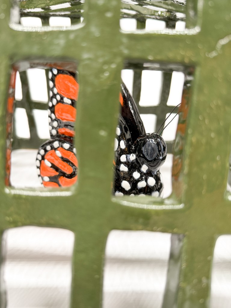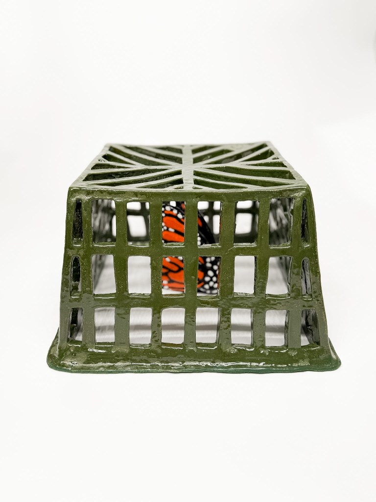 La Pesadilla Americana is a large-scale ceramic strawberry basket sold by fruit street vendors. They are made of thin, bright green plastic sold as individual baskets or in a box of twelve. Typically, you see them filled with juicy, bright strawberries, but in La Pesadilla Americana, the bright green strawberry basket is flipped upside down, creating a cage. Inside the ceramic strawberry basket cage is a ceramic monarch butterfly. Representing the hard labor of immigrants that is behind the food that sustains us while sustaining them and their families. Immigrants’ labor is overlooked in the United States, and in return, they get caged.