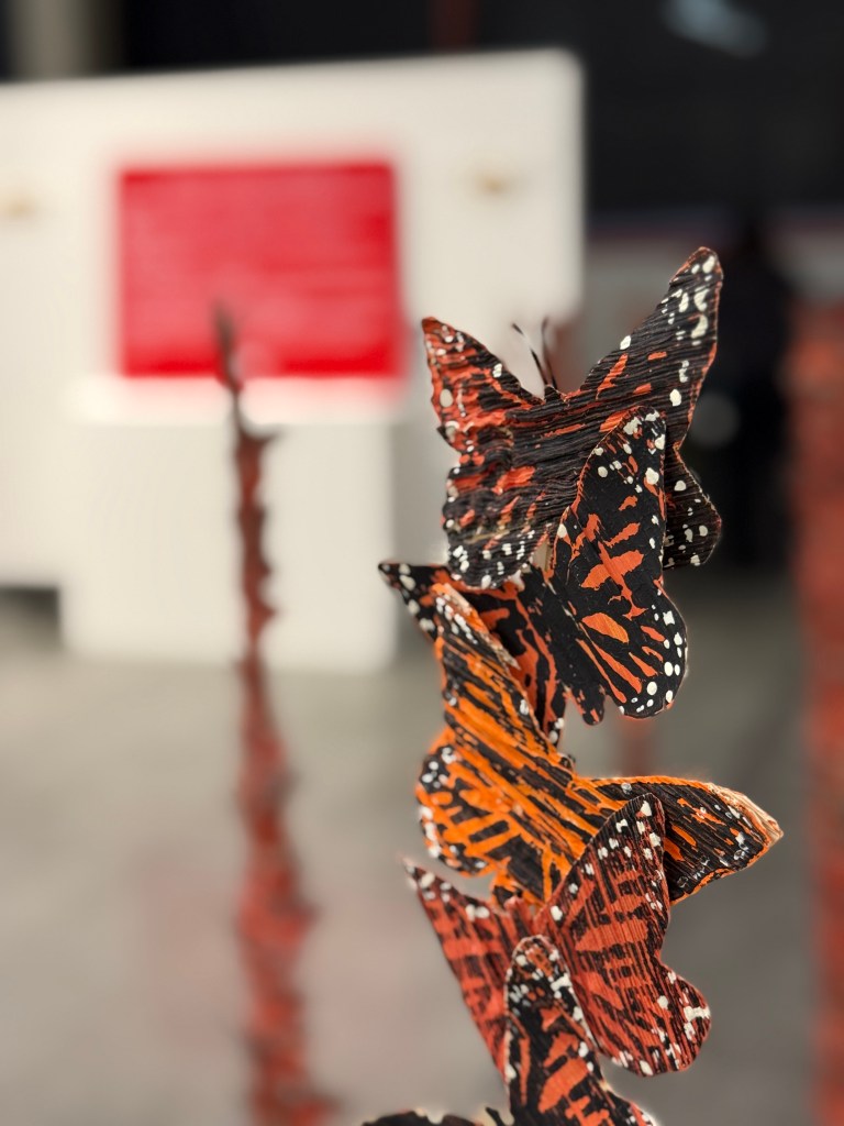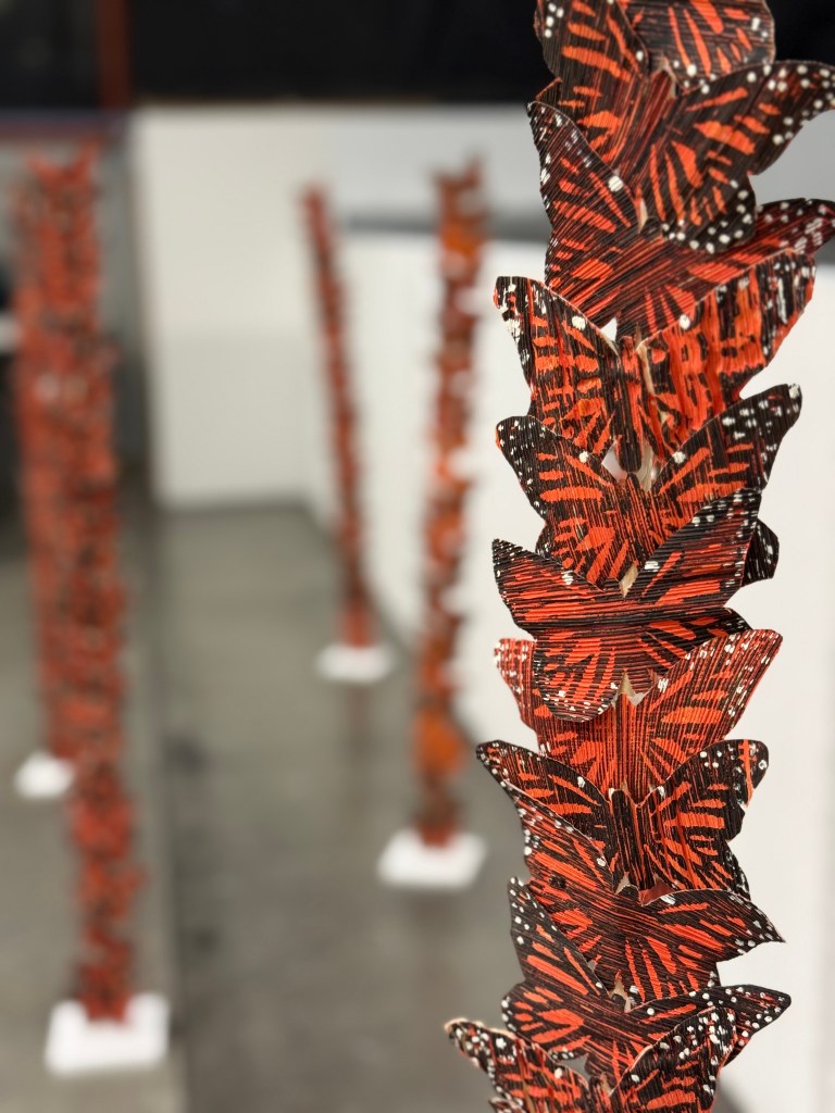 The use of corn husks in this sculpture evokes memories of community and family through food. While the lines of monarchs showcase immigrants’ resistance to protect their community.