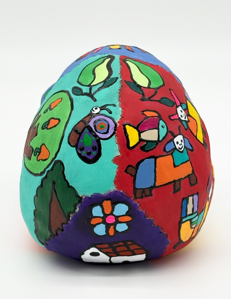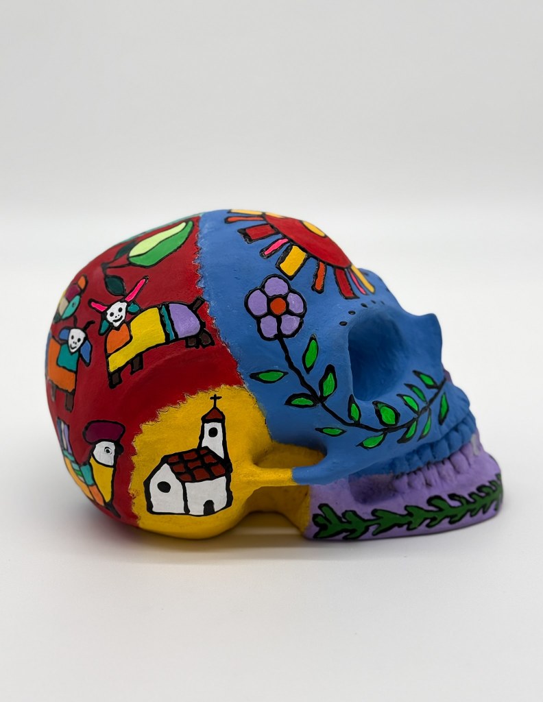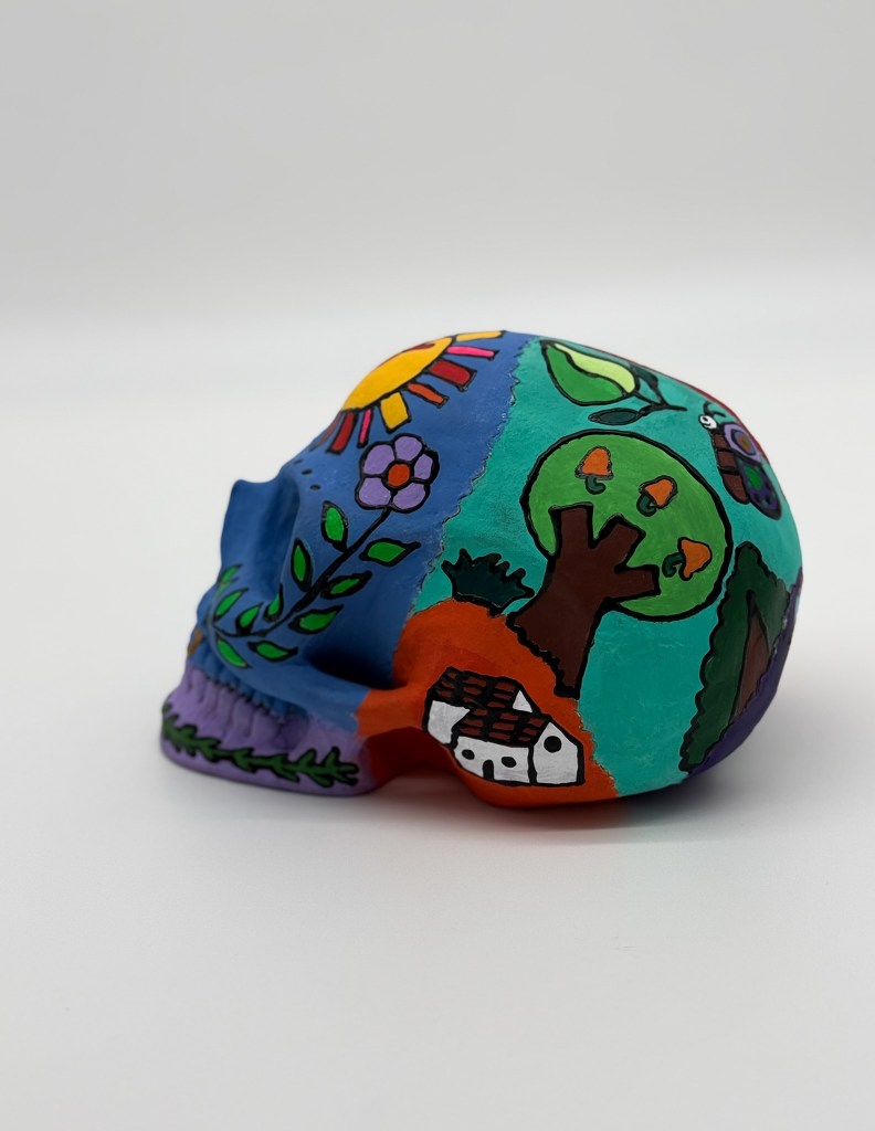 However, just like when the ripened fruit on a marañón (cashew fruit) tree falls, I must also fall back down to reality. This skull covered in traditional Salvadoran folk art interprets the thought that consumes me time and time again.