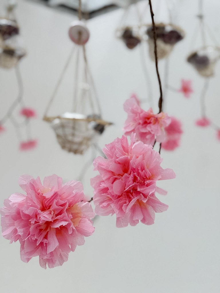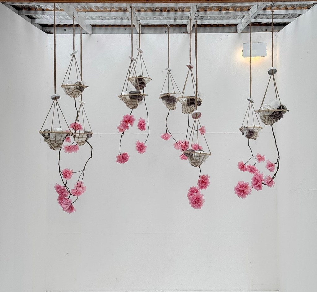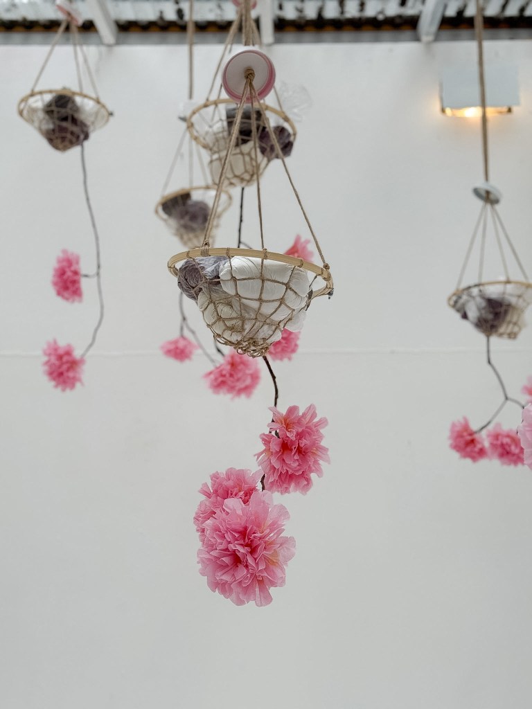 Medium: Twine, embroidery hoops, jar lids, handmade paper flowers, found sticks, and Alimentos